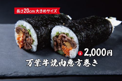 花房精肉店では現在 ”恵方巻き”の予約受付中です。万葉牛焼肉恵方巻きと万葉牛ミルフィーユカツ恵方巻きの2種類。長さ20センチの大きめサイズです。