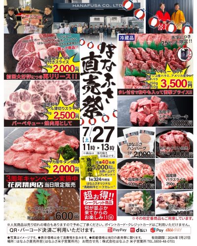 7/27(土) 2時間限定「はなふさ直売祭」、7/27(土)~7/29(月)の3日間「花房精肉店3周年記念」開催されます。