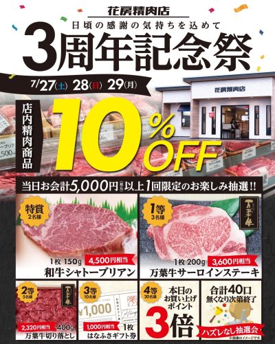 7/27(土)~7/29(月)の3日間は「花房精肉店3周年記念」開催!店内精肉商品10%OFF!お買い得となっています。