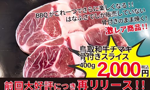 今回の目玉商品は、前回大好評につき再リリース!骨付きのまま焼く「鳥取和牛チマキ骨付きスライス」。はなふさでしか販売されていない激レア商品です。このお肉があるだけでバーベキューがさらに楽しくなりますよ。