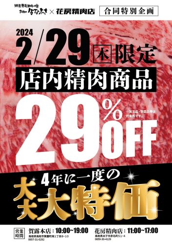 「お肉のはなふさ 賀露本店」x「花房精肉店」の合同特別大特価企画が、2024年2月29日 (木)限定で開催されます。