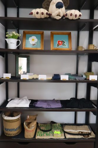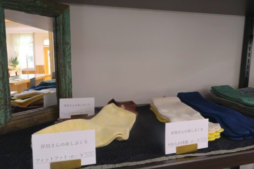 鳥取市用瀬町にある『岸田工房』で作られている「岸田さんのあしぶくろ」はオーナーおすすめの商品。その他、オーナー手作りのエプロンなど、こだわりの雑貨が並んでいます。