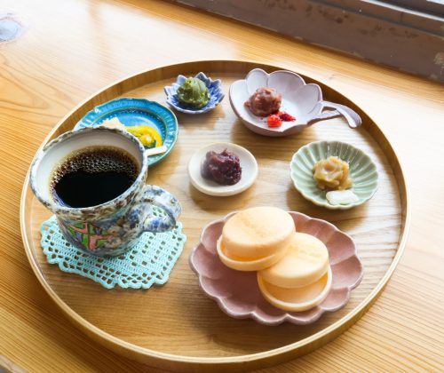 5種類のあんと、最中の皮が2つ。コーヒーの付いた『最中プレート』。一日限定3セット。あんは季節によって変わります。ドリンクは変更できます。