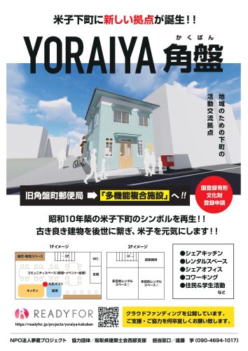 2024年春頃、鳥取県米子市にある旧角盤町郵便局(旧角盤文庫)が多機能複合施設「YORAIYA角盤」に生まれ変わります。その事業費の一部をクラウドファンディングで募っています。
