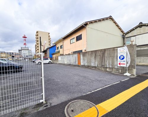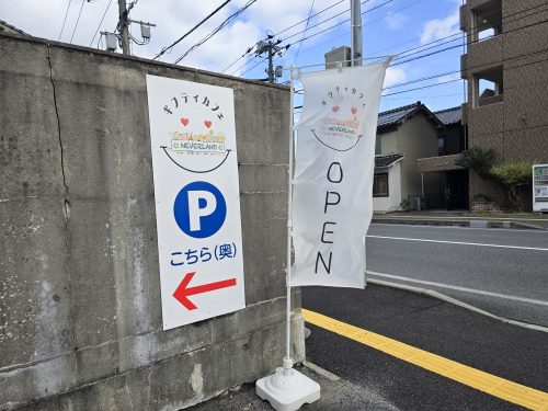 お店は道路から少し奥まった場所にあるため、やや分かりにくいかもしれません。目印は「OPEN」の旗と、駐車場への案内板です。