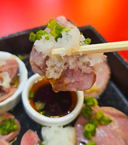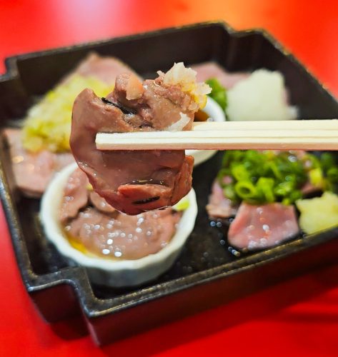 石見ポークを使用し、低温調理で提供される「ホルモン刺し4種盛り合わせ」。内容は、豚タンのねぎ塩ダレ、豚ハツのおろしポン酢、大山鶏レバーのコンフィ、大山鶏砂肝の塩胡麻油の4種盛り合わせです。