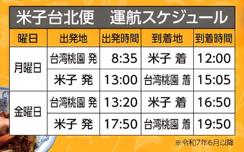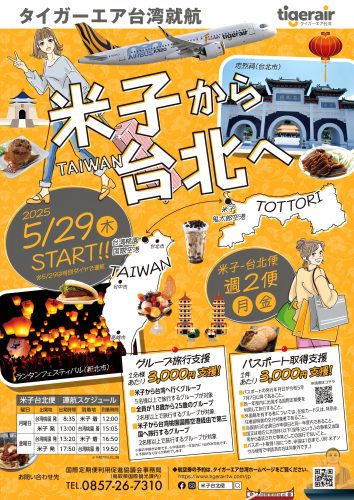 2025年5月29日(木)から、米子鬼太郎空港と台湾桃園国際空港を結ぶ便、米子ー台北便の就航がスタートします。月曜日と金曜日の週2便運航されます。