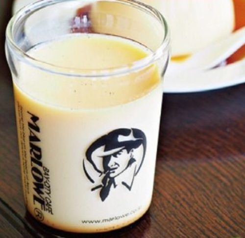ビーカー入りの手作り焼きプリン専門店『マーロウ』のカスタードプリン。厳選食材を使用し、卵の力だけで固めた昔ながらの手作り焼きプリン。