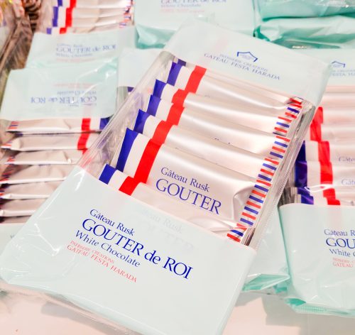 洋菓子店『ガトーフェスタ ハラダ』の「グーテ・デ・ロワ ホワイトチョコレート」。ガトーラスクの片面に、ホワイトチョコレートをコーティングしてあります。