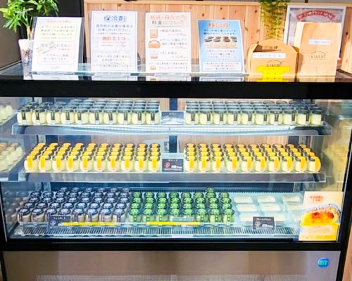 店内に入ると、すぐ目の前のショーケースにカラフルなプリンがずらり。(※抹茶は現在販売休止中です。(4/19現在) 5月再販予定。Instagramをチェック)