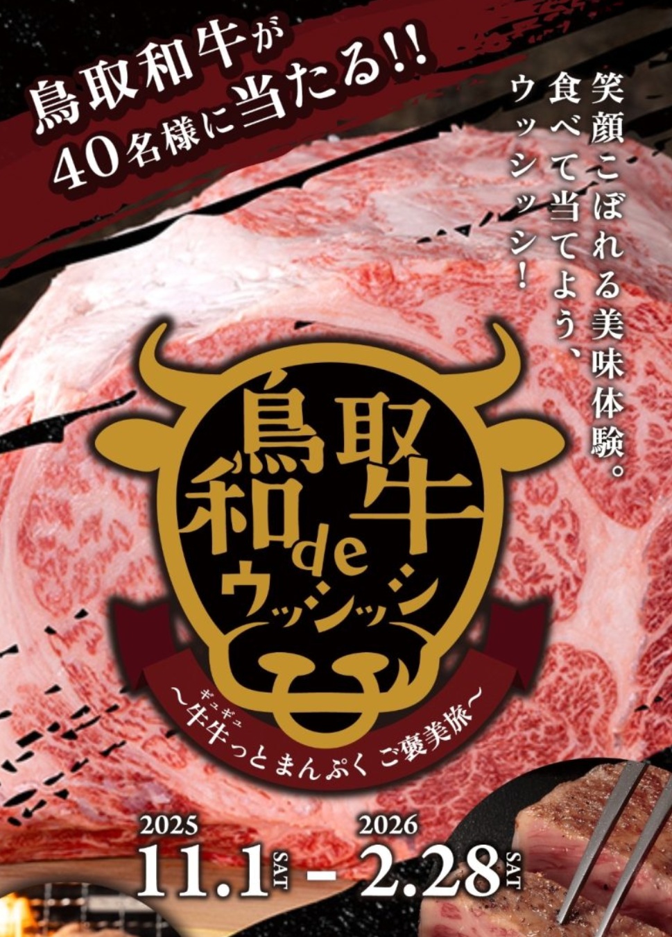 抽選で合計40名様に鳥取和牛肉が当たる「鳥取和牛deウッシッシ ~牛牛(ギュギュ)っとまんぷくご褒美旅~」キャンペーンを実施しています。