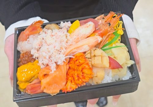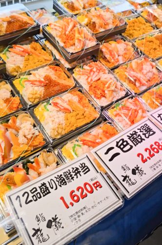 花咲ガニなど3種類のカニの他、いくら、うに、赤エビなど10種類の海鮮を豪華に盛り付けた「美味求真プレミアム弁当」もおすすめ。