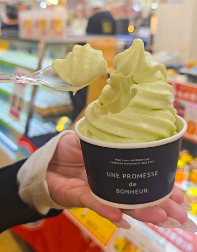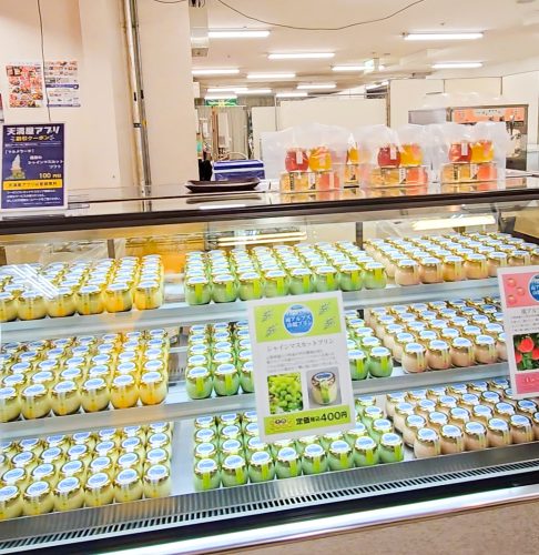シャインマスカットを贅沢に使った農家の「シャインマスカットソフト」は、各日100個限りです。