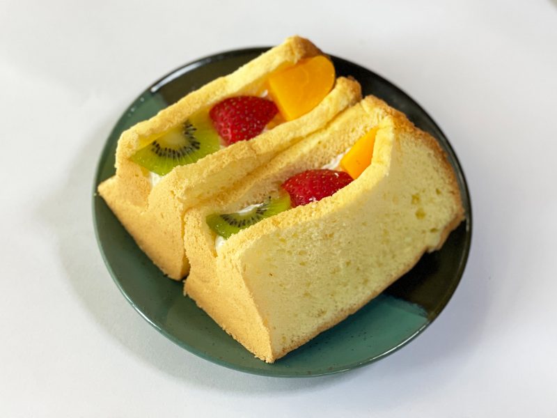 ふわふわのシフォンケーキにクリームとフルーツが入っています。あまいクリームと酸味のあるフルーツ。それを包むふわふわシフォン。
