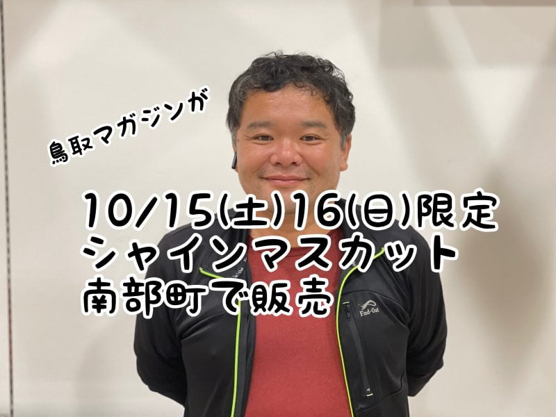 ![]() | 【米子市】10/15(土)~10/16(日) 鳥取マガジンがシャインマスカット販売 鳥取県西伯郡南部町天萬328。就労継続支援A型事業所アローズの駐車場。 |