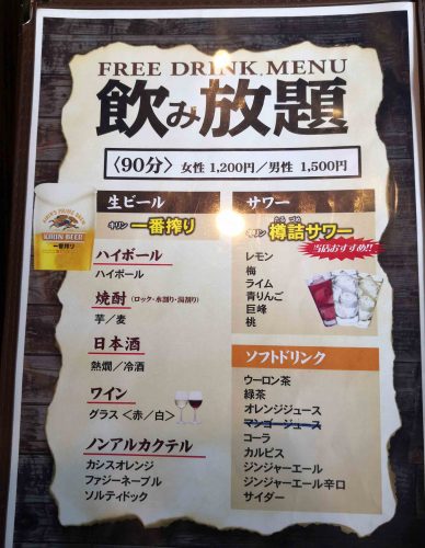 宴会などのコースは予算に応じてお願いできます。飲み放題は90分で女性1,200円 / 男性1,500円。