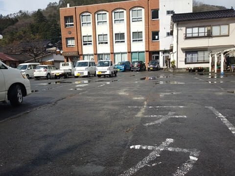 駅前の信号から細い道を入って蓬莱のお店の裏手にまわると、駐車場があります。商工会議所前の駐車場にとめられます。
