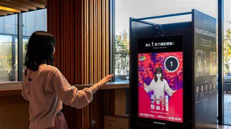 ジェスチャー操作によりサイネージで自撮りした写真や動画をダウンロードしてスマホで持ち帰ることができるカメラ。太陽光で発電した電力を使って会場オリジナルの来場記念写真が撮影できます。