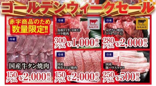 ゴールデンウィークでおいしいお肉を食べたい方にぴったりのセールです。目玉商品は、国産牛タン焼肉、鳥取F1牛(交雑牛)バラ焼肉、ふぞろい焼肉(バラ・ロース)、国産和牛ミスジ焼肉など。