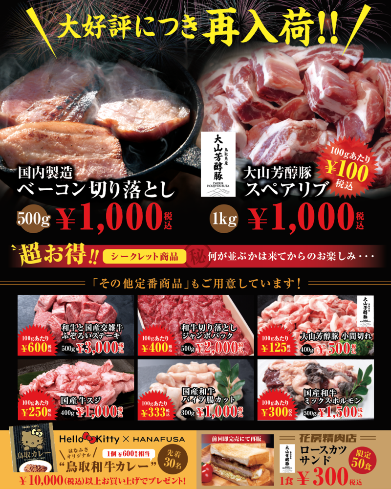 国内製造 ベーコン切り落とし、大山芳醇豚 スペアリブ、和牛と国産交雑牛 ふぞろいステーキ、和牛切り落とし ジャンポパック、大山芳醇豚 小間切れ、国産牛スジ、国産和牛 パイプ腸カット、国産和牛 ミックスホルモンなど。