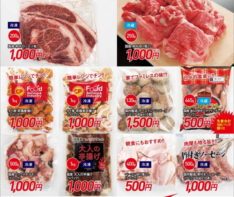 当日は牛肉、豚肉、鶏肉を始め、唐揚、ハンバーグ、ベーコンなどが卸値のリーズナブルな価格で販売されます。