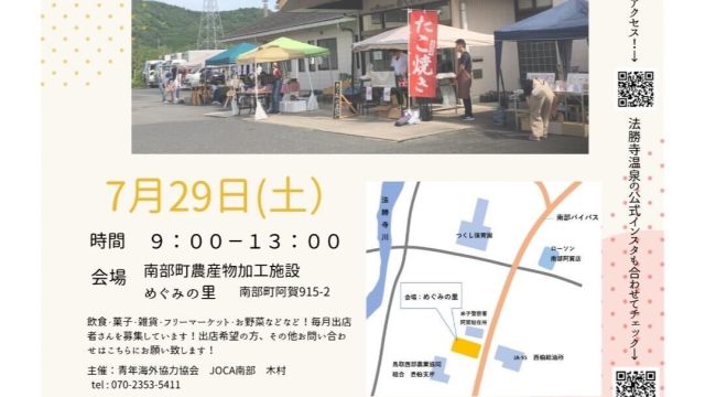 鳥取マガジンが(JOCA南部の一員として)めぐみの里マルシェに参加します。日時は2023年7月29日(土)9:00~13:00。場所は西伯郡南部町にあるめぐみの里。