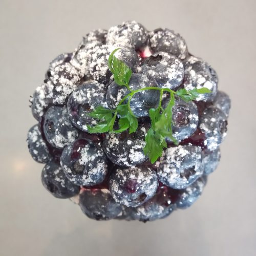 自家製のブルーベリーソースをガラスに回しかける。