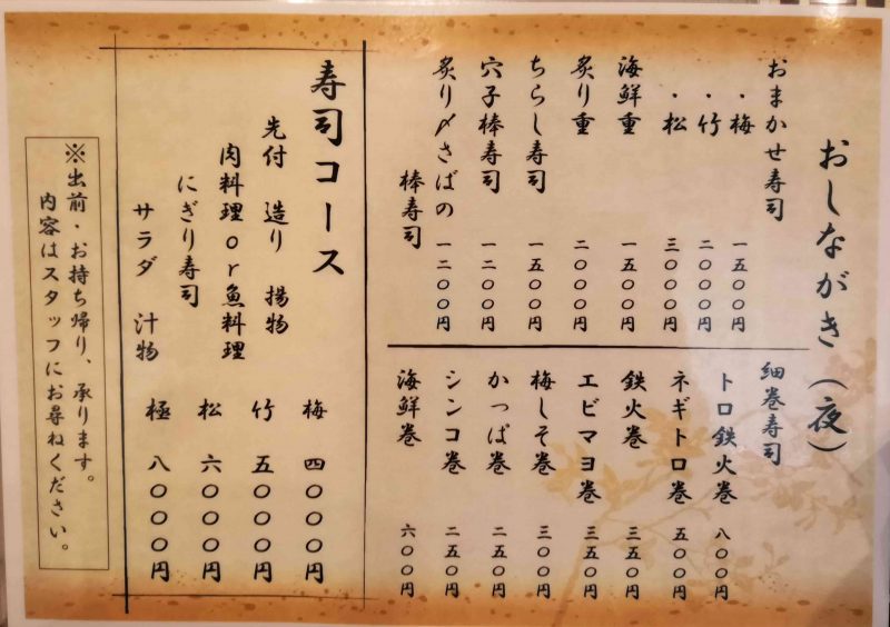 夜のメニューはこちら。おまかせ寿司、海鮮重、炙り重や、寿司コースもあります。