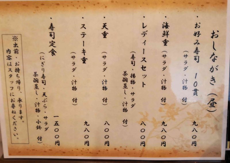 お好み寿司 10貫(サラダ・汁物付)、海鮮重(サラダ・汁物付)、レディースセット(寿司・揚物・サラダ、茶碗蒸し・汁物)、天重、ステーキ重、寿司定食など。