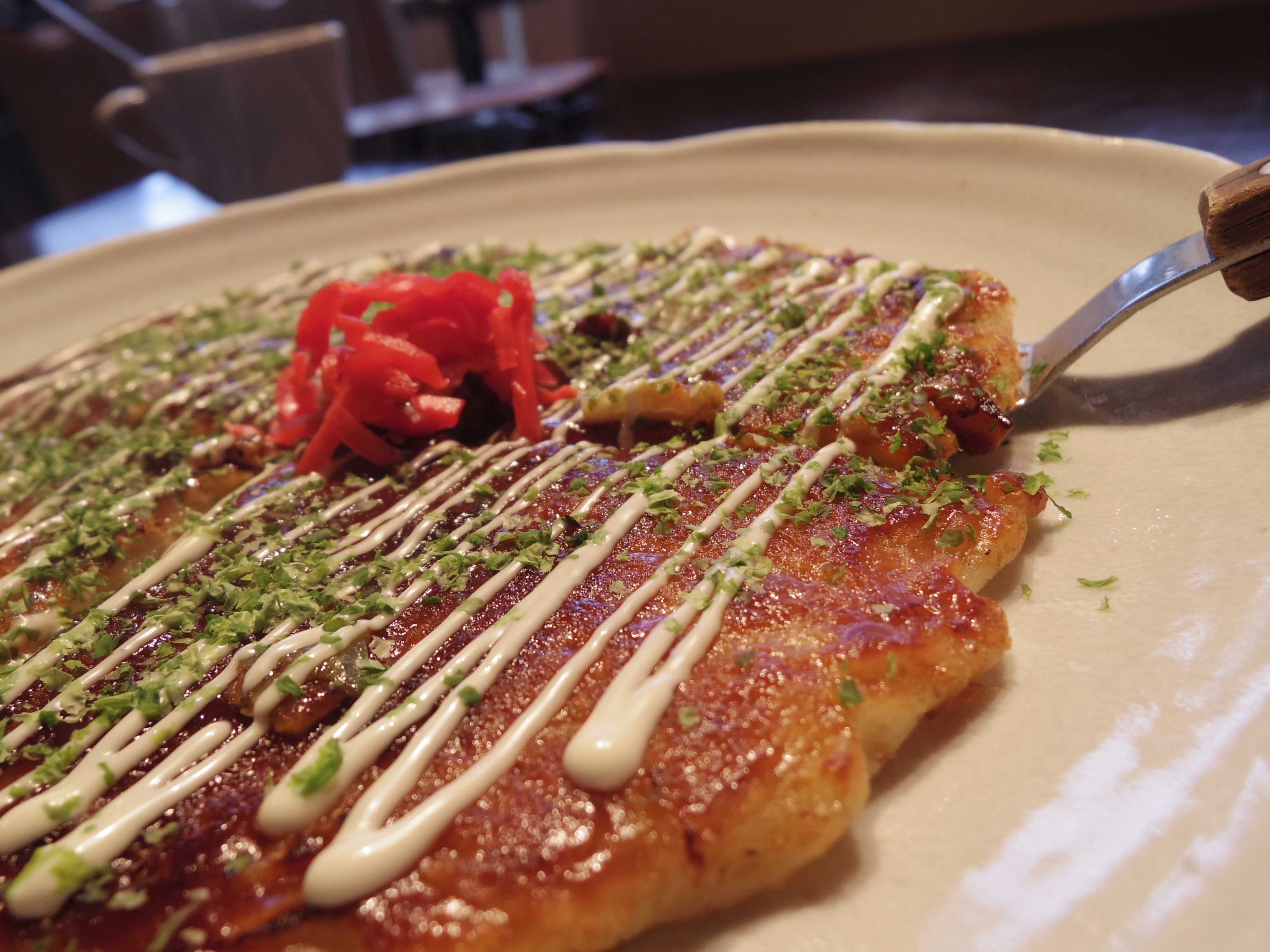 これは一般に出てくるお好み焼きとは違います。ふわっ、サクッ!生地が薄めで、下の部分がさくさく、上の生地はふわふわ。みそら食堂オリジナルのお好み焼きです。独特の食感ですね。