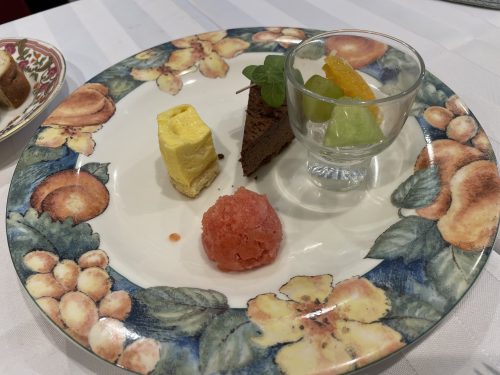 パッションマンゴーのムースケーキ、ガトーショコラ、すももシャーベッド。