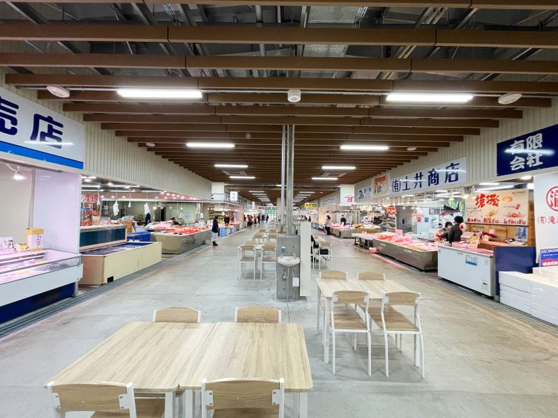 通路にはたくさんのテーブル席があります。ここで休憩をしたり、買った魚・かにを新鮮なままで食べることができます。