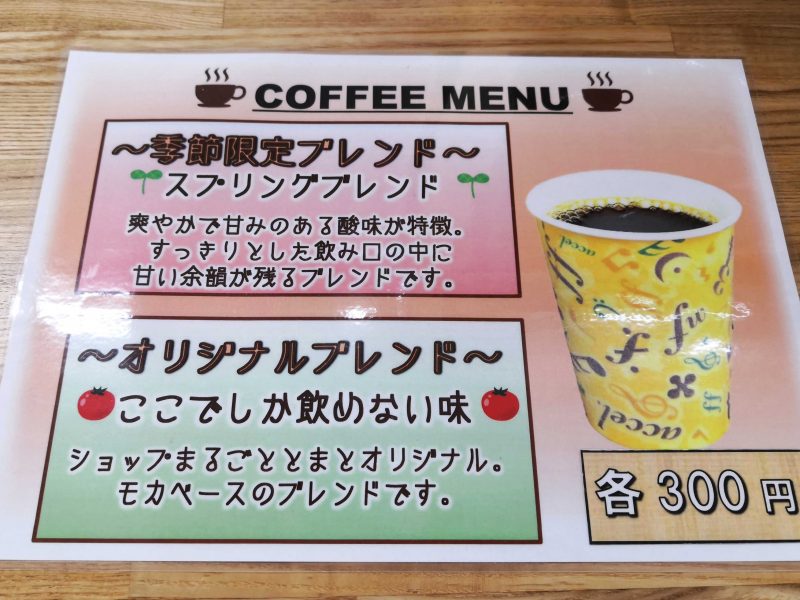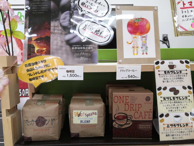 店頭でも珈琲豆とドリップコーヒーの販売がされています。珈琲豆は ショップまるごととまとだけのオリジナルブレンド。