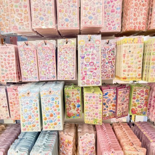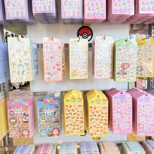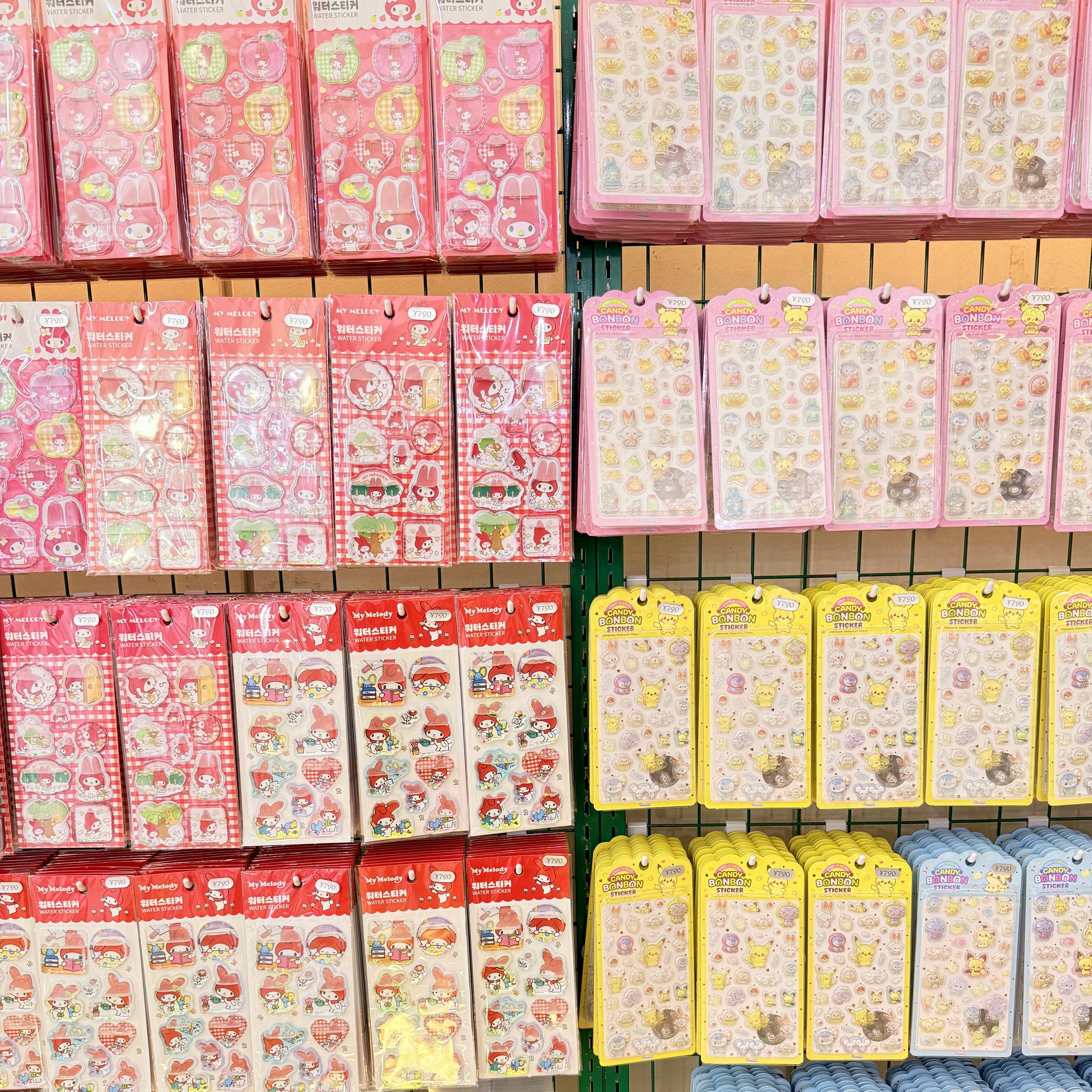 店内には特設のシールコーナーが設けられ、棚には溢れんばかりのラインナップが。 「ボンボンドロップ」をはじめ、キラキラ揺れる「ウォーターシール」、「おしりシール」など、まさにシールの宝庫です。とくにキャラクターシールが豊富な印象があります。