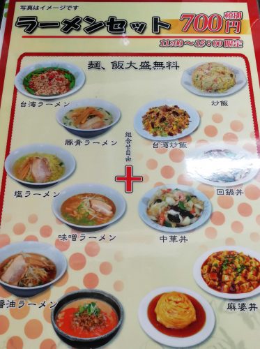台湾ラーメン・豚骨ラーメン・塩ラーメン・味噌ラーメン・醤油ラーメン・担々麺