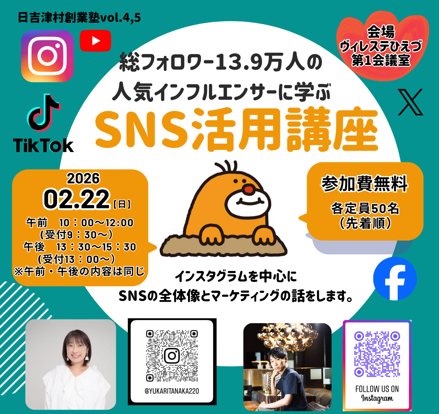 2026年2月22日(日)、日吉津村にあるヴィレステひえづで「SNS活用講座」を開催します。