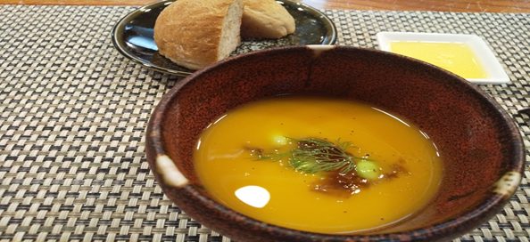 スープ:和牛コンソメジュレ入りのバターナッツカボチャのスープ