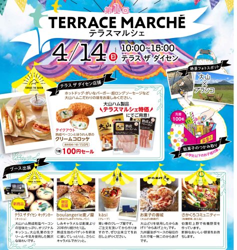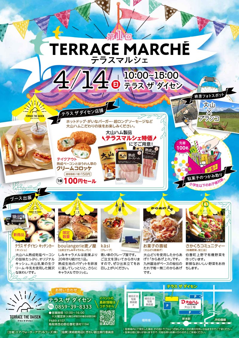 「第1回テラスマルシェ」が大山のふもとにあるテラスザダイセンで開催されます。日時は4/14(日)10:00〜15:00。
