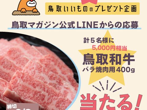 「鳥取和牛 バラ焼肉用400g(5,000円相当)」を5名様にとして「鳥取和牛 バラ焼肉用400g(5,000円相当)」を5名様にプレゼントします。応募は鳥取マガジン公式ラインの応募フォームからお願いします。↓公式ラインはコチラ鳥取マガジン...