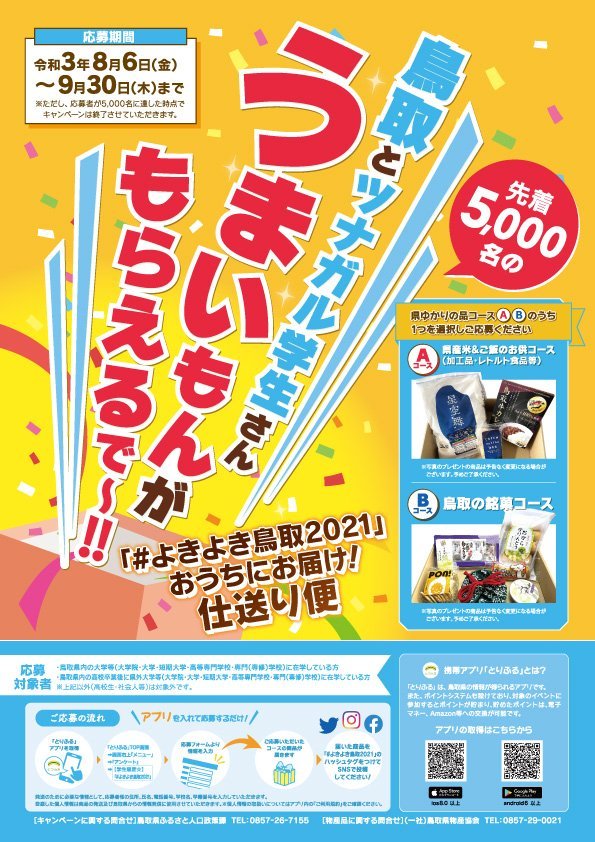 今回の「県産品でコロナ禍の学生を応援!「#よきよき鳥取2021」仕送り便」の応募もこの「とりふる」で受付しています。
